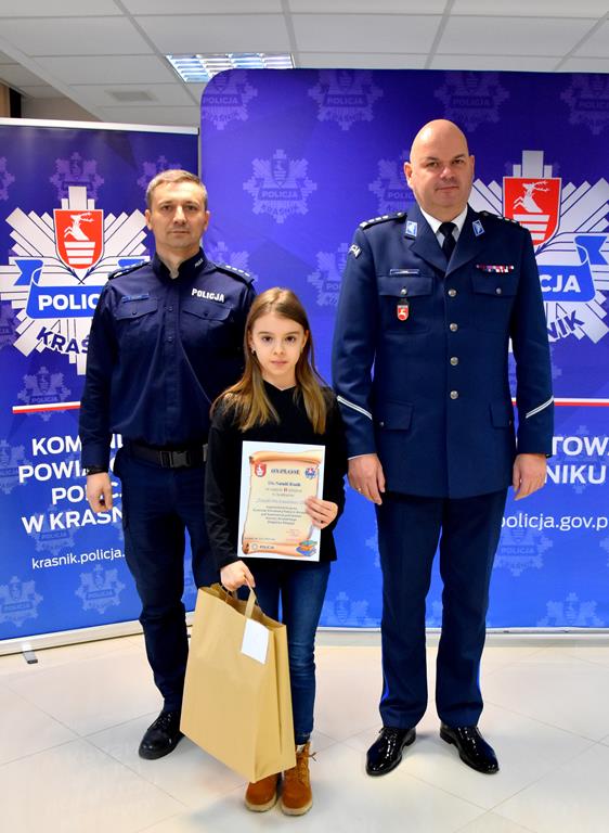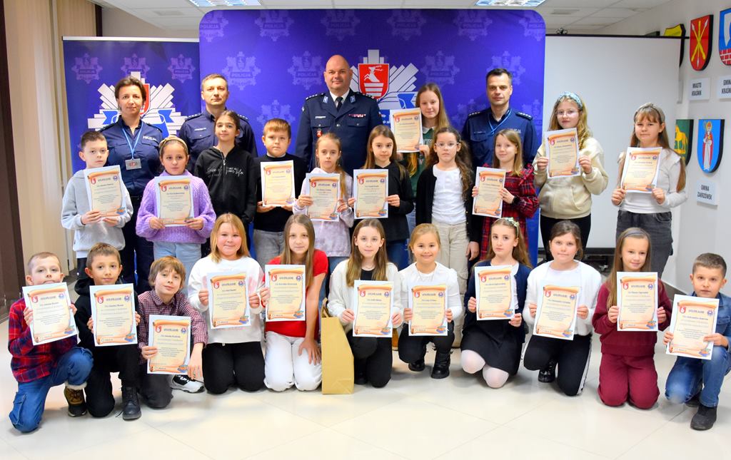 Nagrody wręczył Komendant Komendy Powiatowej Policji w Kraśniku inspektor Jacek Figiel oraz Naczelnik Wydziału Prewencji nadkomisarz Przemysław Wronka. Całość zakończyła się pamiątkowym wspólnym zdjęciem. Dziękujemy serdecznie wszystkim za włożony wkład pracy i życzymy dalszych sukcesów, a sponsorom za wsparcie. Konkurs przeprowadzili policjanci z komórki d/s profilaktyki dziecięcej kraśnickiej Komendy.