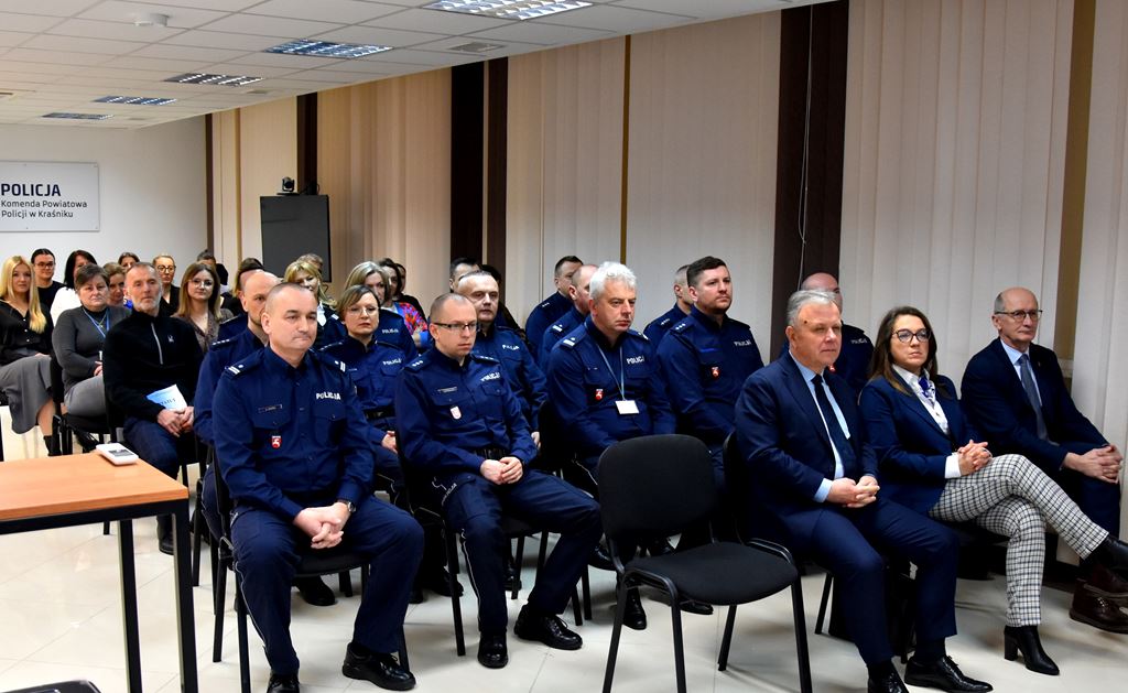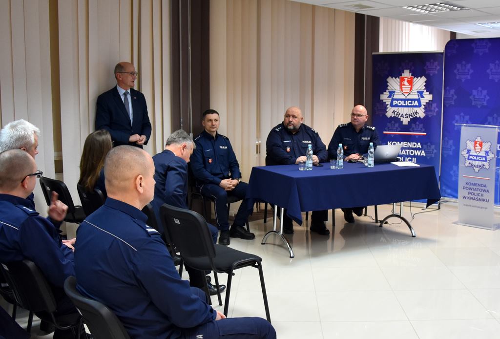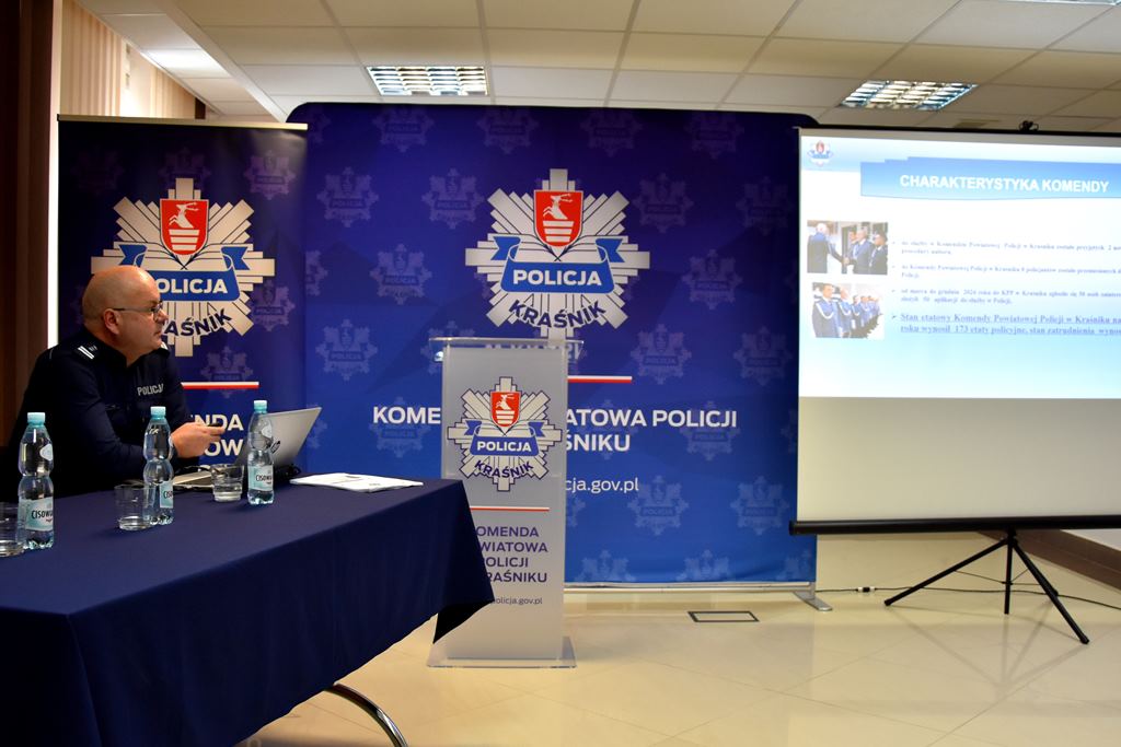 Następnie Komendant Powiatowy przedstawił na prezentacji multimedialnej osiągnięcia kraśnickiej Komendy z zakresu prewencji, logistyki, bezpieczeństwa w ruchu drogowym oraz przestępczości kryminalnej. Podkreślił zwalczanie przestępczości narkotykowej i gospodarczej, przypomniał o działaniach profilaktycznych. Ważnym punktem było poinformowanie, że w niedługim czasie do użytku zostanie oddany nowy budynek komisariatu w Kraśniku. Remontu doczeka się również sama Komenda. Z zakupów centralnych trafi kolejnych kilka nowych radiowozów.