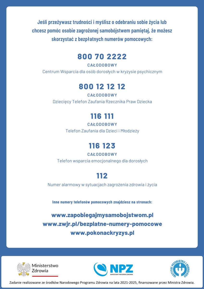 Apelujemy, aby NIE lekceważyć żadnych sygnałów świadczących o tym, że ktoś może potrzebować pomocy, takich jak: wycofanie społeczne, nagłe pogorszenie nastroju, groźby samookaleczenia, pożegnalne wiadomości, czy rozmowy o bezsensie życia. Każda z takich sytuacji może oznaczać realne ryzyko i wymaga natychmiastowej reakcji.